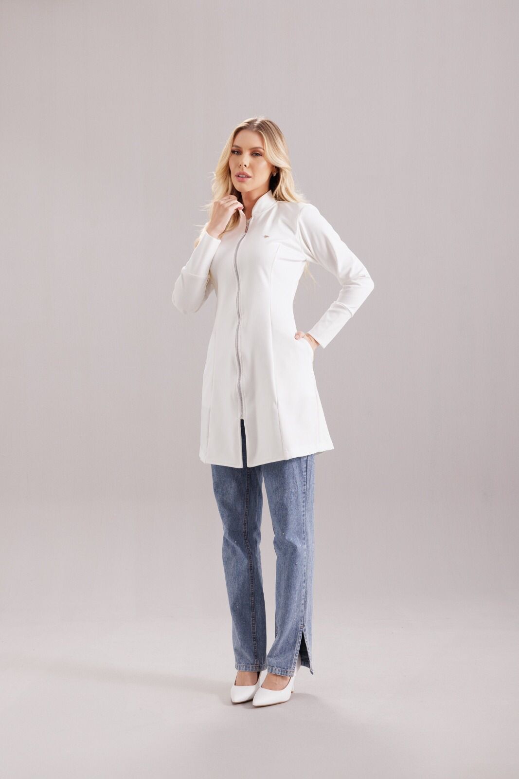 O Jaleco New Tokio é confeccionado em malha tipo alfaiataria de gramatura alta com elastano, com alta elasticidade, garantindo modelagem estruturada, toque macio e conforto.